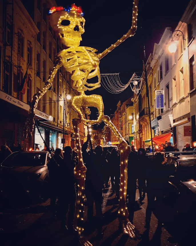 Squelette monumental créé pour le Dia de Muertos à Bruxelles. Sculpture en carton avec jeux de lumières intégrés qui donne vie à Adriana lors de la parade nocturne.